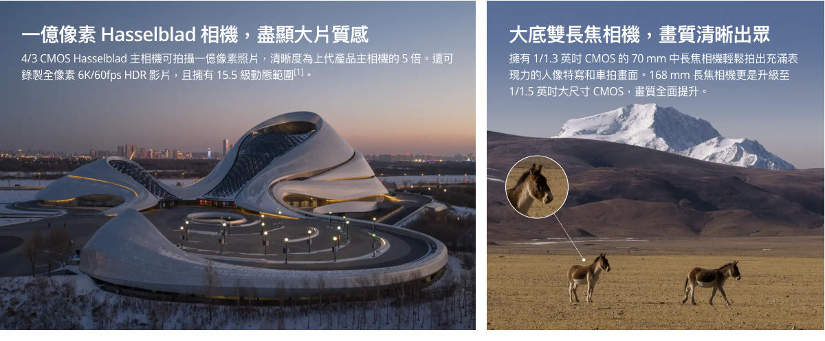 1. 主相機性能更出色:Hasselblad 主相機採用新一代 4/3 CMOS 及圖像處理平台,支援 1 億像素照片拍攝,最高支援 6K/60fps HDR 影片錄製,影片動態範圍高達 15.5 級*。