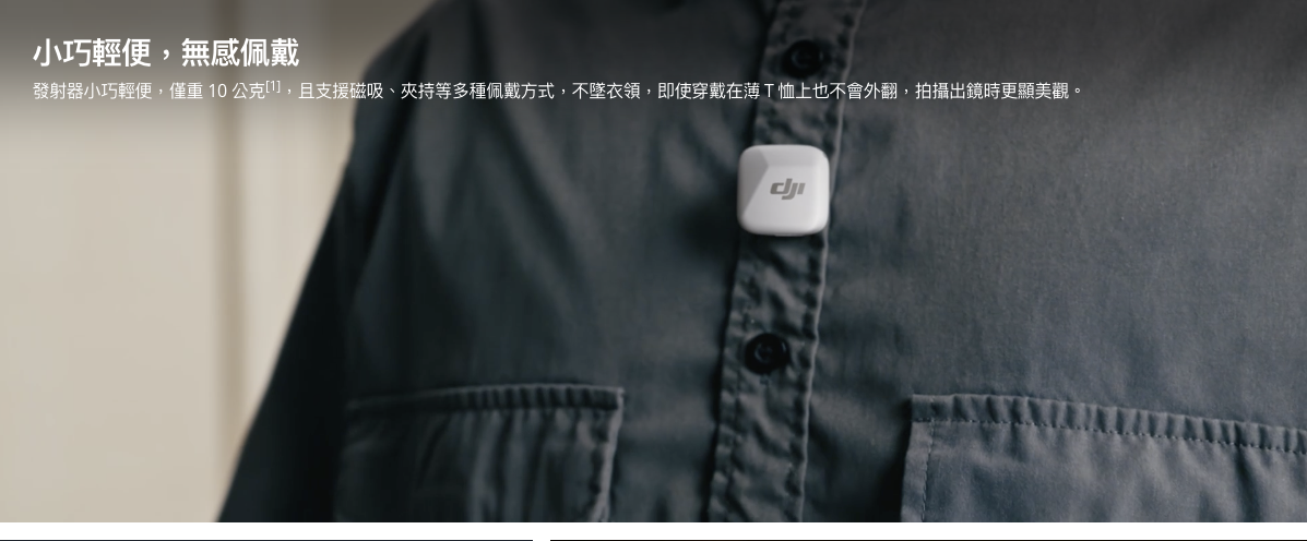 1. DJI Mic Mini 身形更小巧:DJI Mic Mini 發射器小巧、輕便,僅重 10 公克[1],相比 DJI Mic 2,佩戴起來更加輕量、無感;支援磁吸和夾持佩戴方式,不墜衣領,夏天穿薄 T 恤也不會外翻,能滿足不同的佩戴需求。