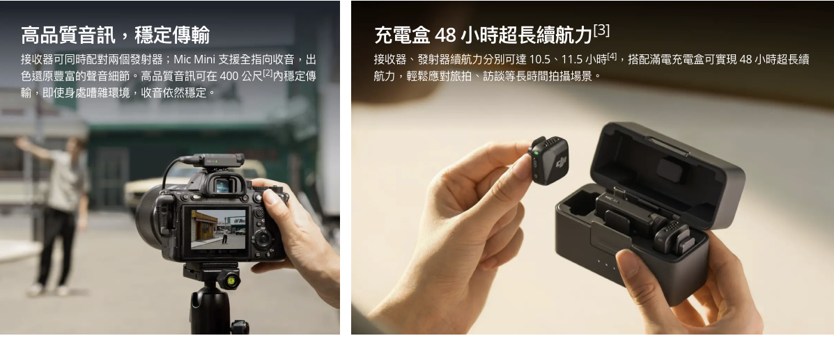 2. DJI Mic Mini 續航力更長:接收器、發射器續航力分別可達 10.5、11.5 小時[4],佩戴後無需頻繁取下充電;搭配滿電充電盒可完整充電約 3.6 次,實現 48 小時[3]超長續航力,能更好適應長時間旅拍、訪談等重度使用場景。