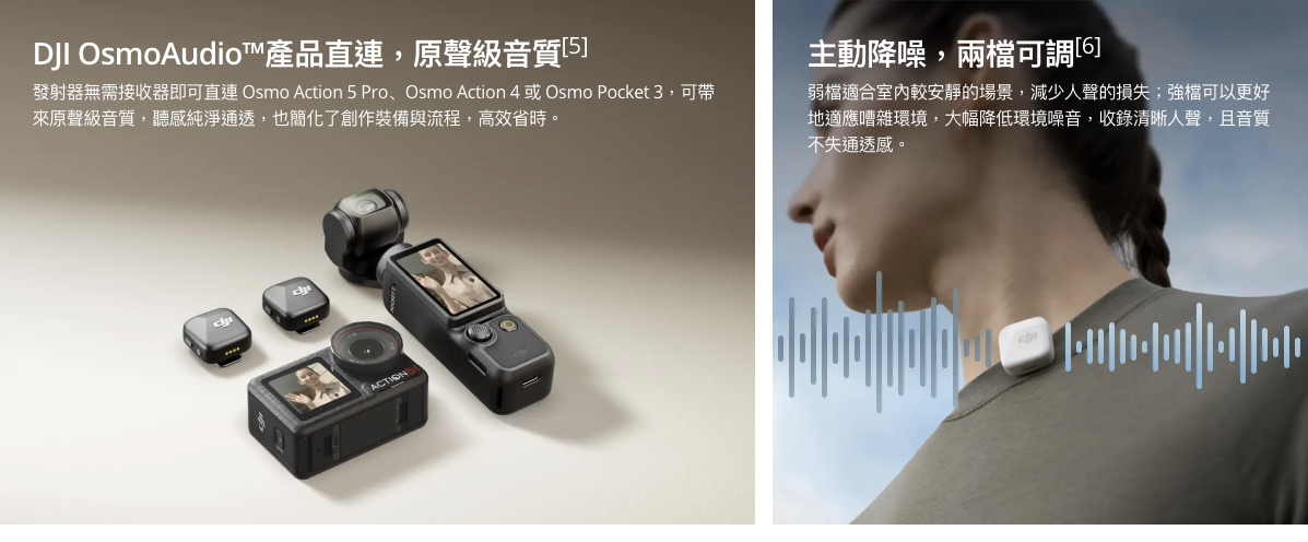 3. DJI Mic Mini 支援兩檔降噪功能:弱檔更適合室內較安靜的場景。