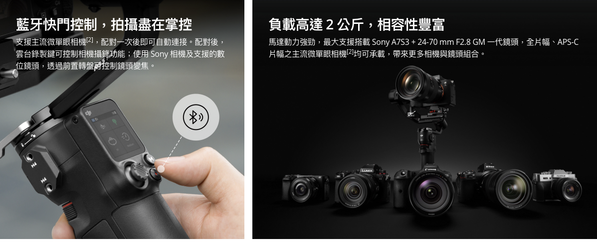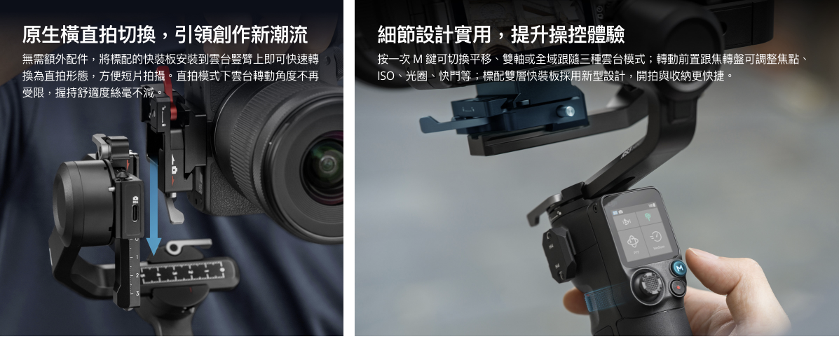 握持輕巧舒適,前置跟焦轉盤符合人體工學。連接快門線後,轉動轉盤即可調整焦點、ISO、光圈、快門等相機參數或控制雲台三軸運動,提升單人創作體驗。