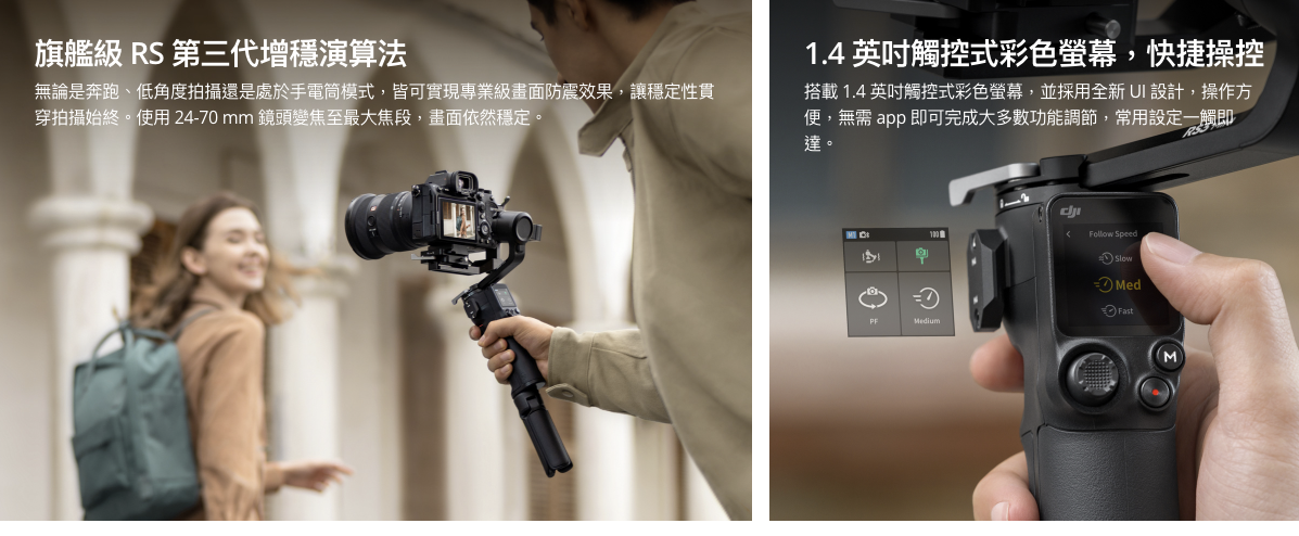 DJI RS 3 Mini 配備三軸雲台並採用與 RS 3 Pro 相同的 RS 第三代增穩演算法,能對市面上主流相機與鏡頭組合掃頻分析,生成適應性穩定演算法控制器,不僅能讓拍攝畫面穩定順滑,減少晃動,還能對多種相機與鏡頭組合、多負載角度的增穩控制進行適應性調節。
