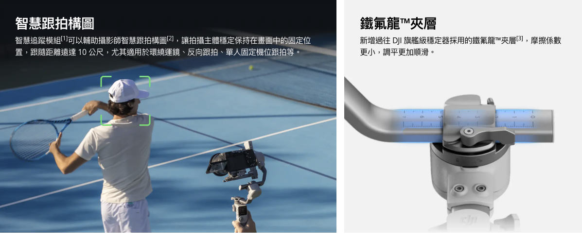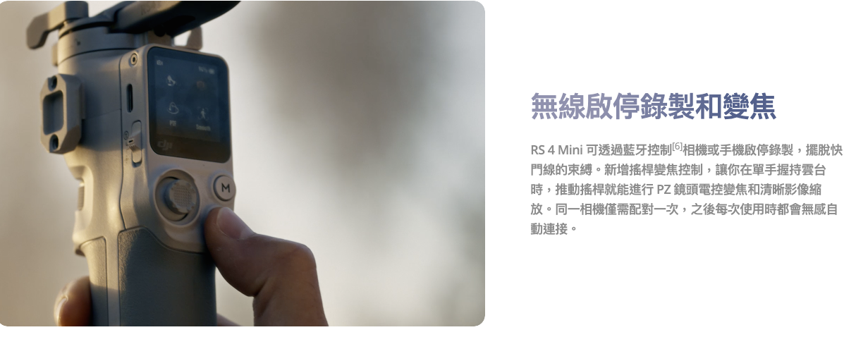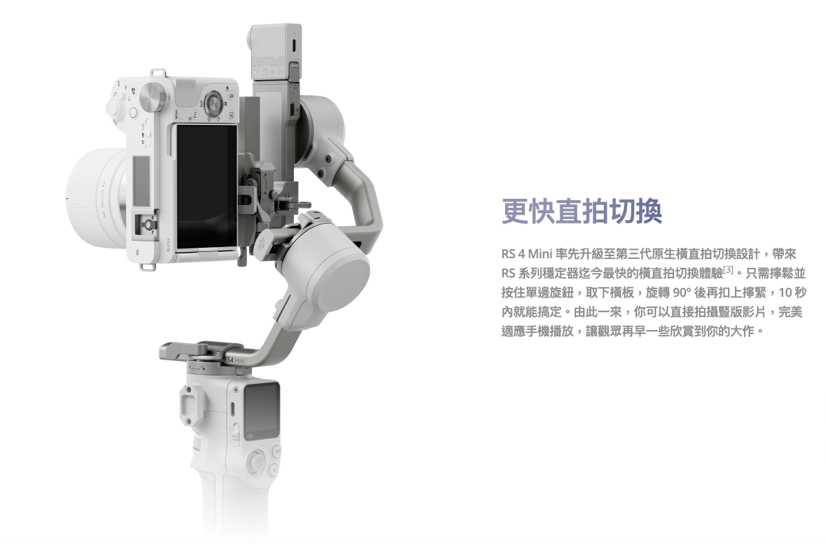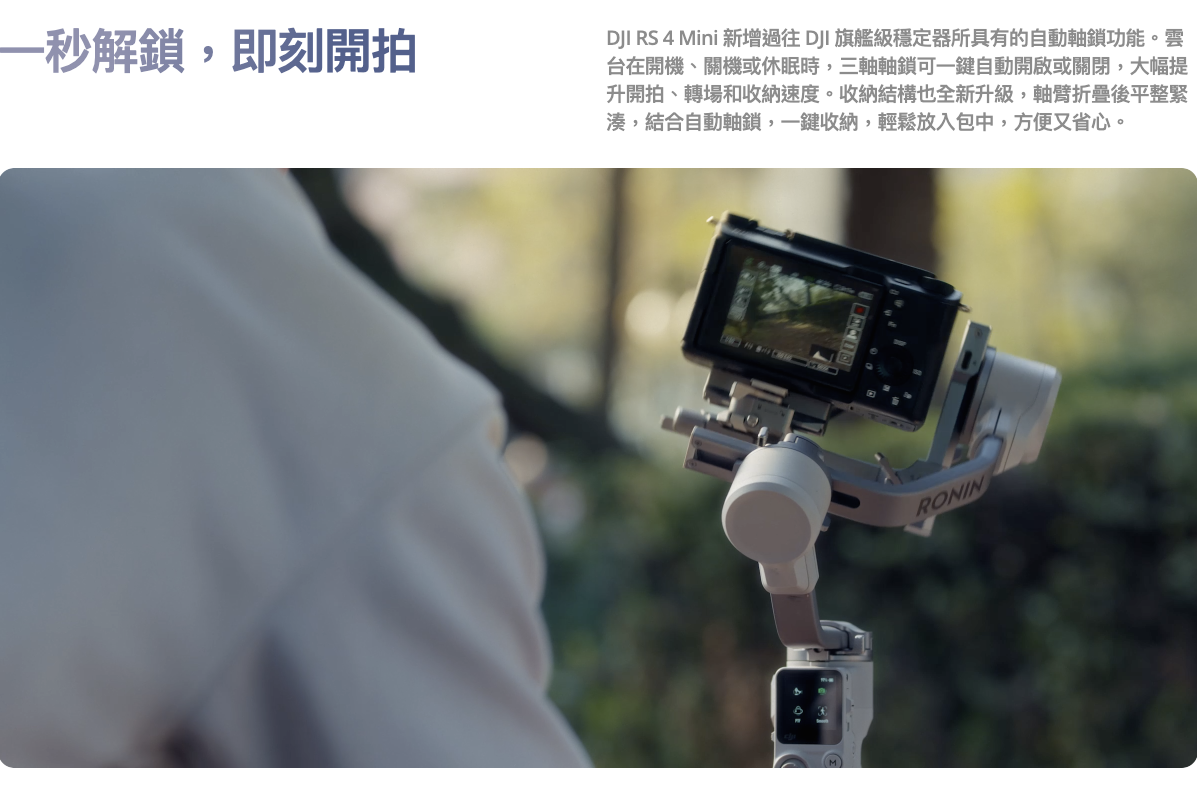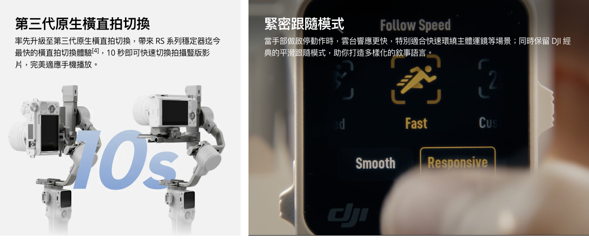 DJI RS 4 Mini 支援平移跟隨、雙軸跟隨、全域跟隨、360 旋轉和自訂模式。