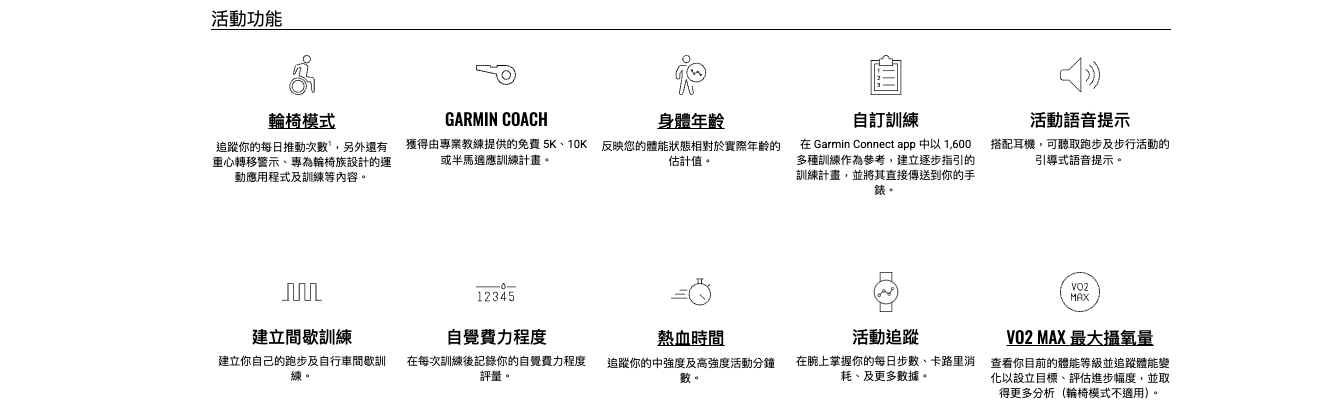 內建 30 多種運動應用程式、訓練及 Garmin Coach,讓你的訓練更有目標且更有效率