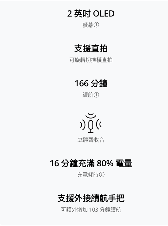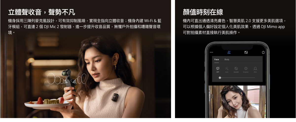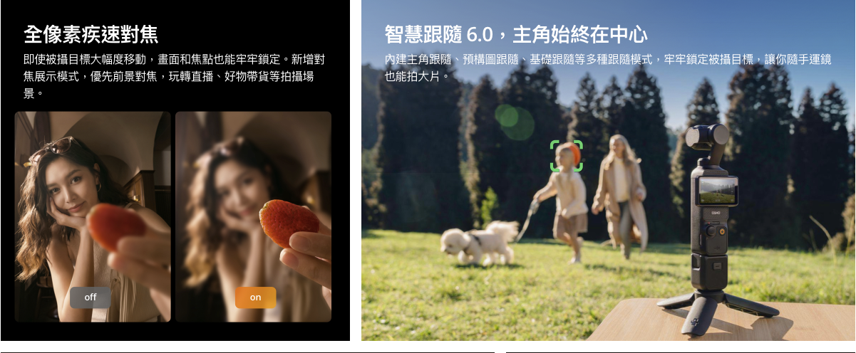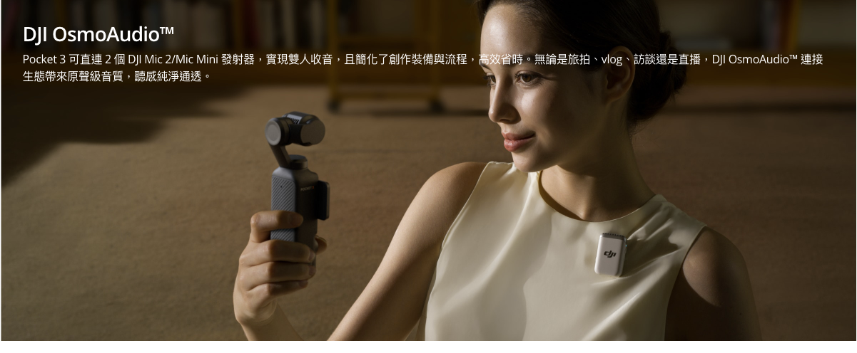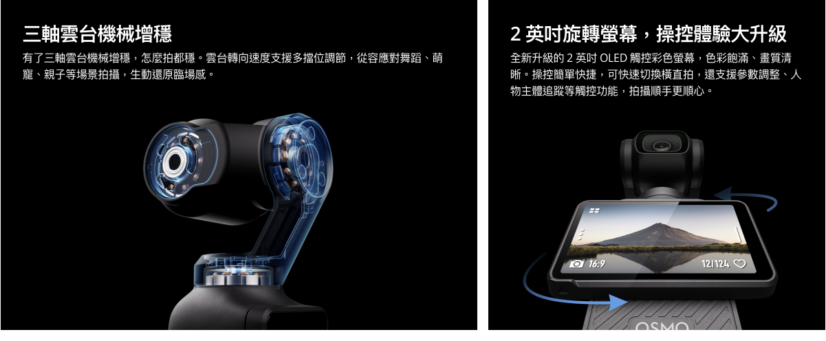 2. 拍攝體驗:機身螢幕升級為 2 英吋 OLED 螢幕,畫面色澤更飽滿,對比度更高;畫面更大並且細節足夠清晰,橫直拍畫面皆可滿螢幕顯示。只需透過螢幕雙擊拍攝目標,即可實現主體追蹤;轉動螢幕還能實現快速開關機,大幅提升拍攝體驗。Pocket 3 機身內建 Wi-Fi,無需全能手把,就能直接連接手機,實現快速傳輸素材和編輯分享。