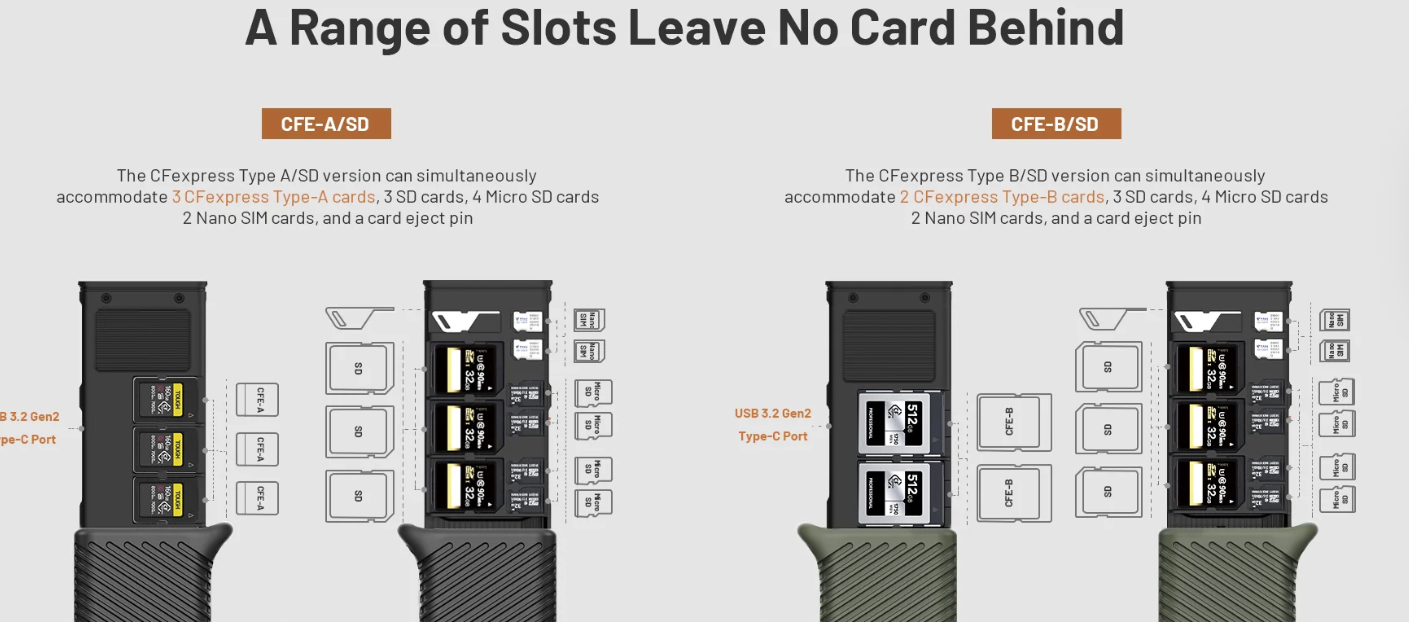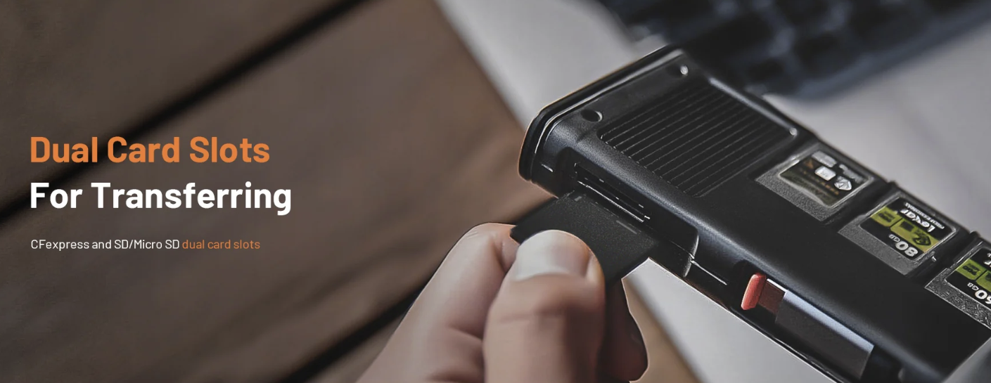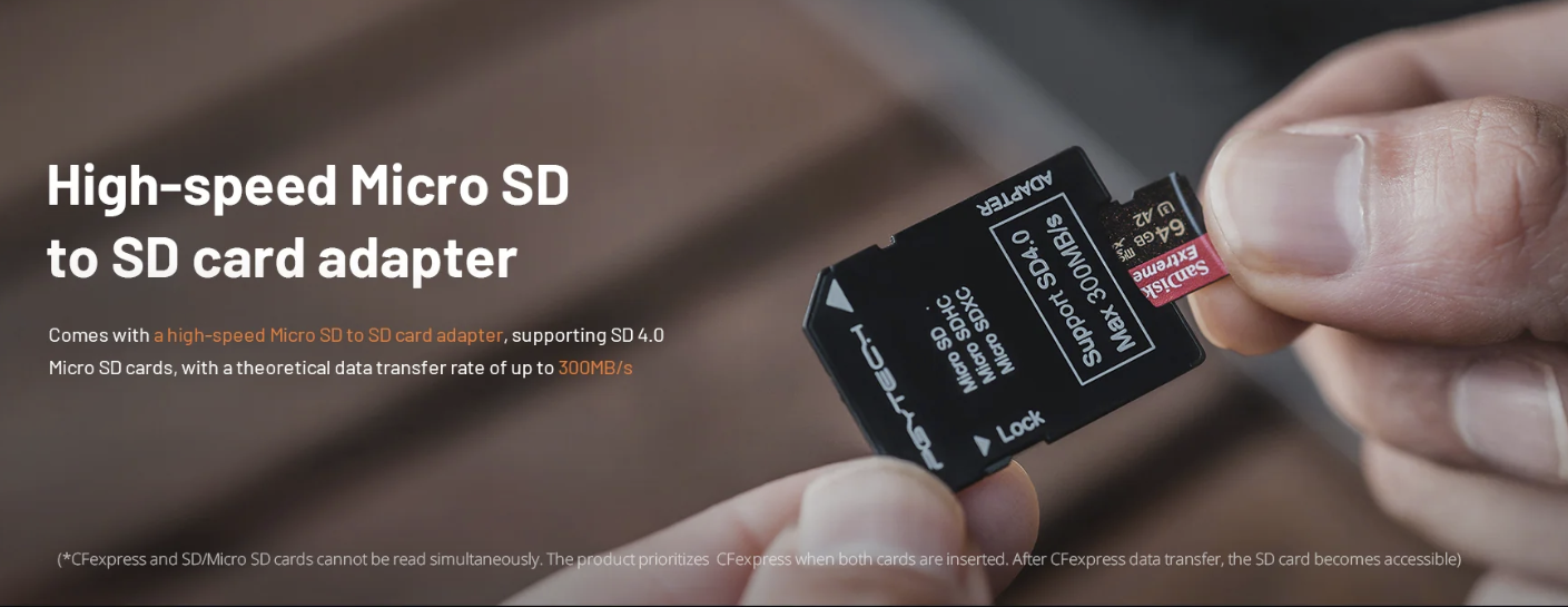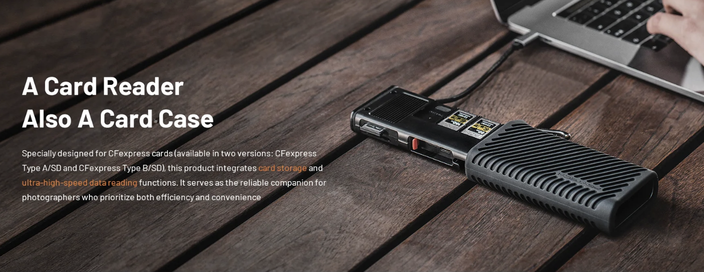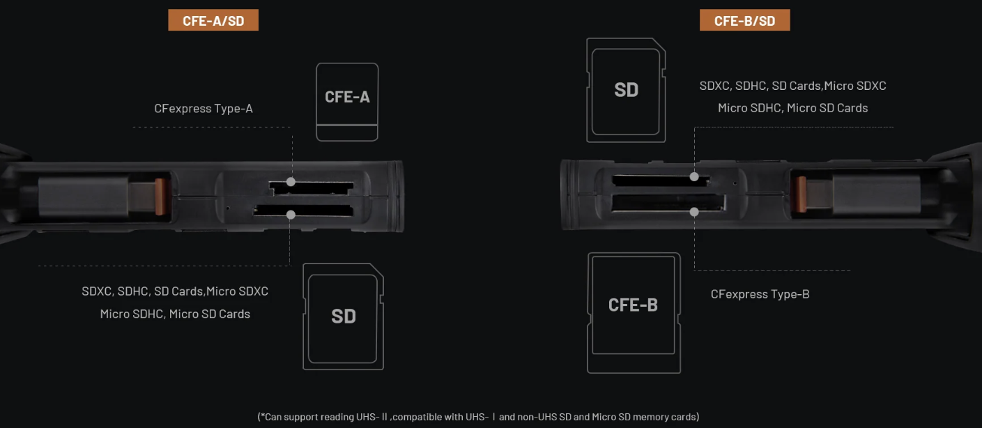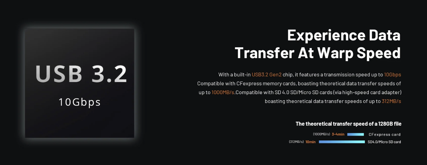 ·USB 3.2 Gen2 晶片使資料傳輸速率高達 10Gbps,支援 1000MB/s 的 CFA/CFB 卡和 312MB/s 的 SD 4.0/Micro SD 卡(附適配器的 Micro SD)。