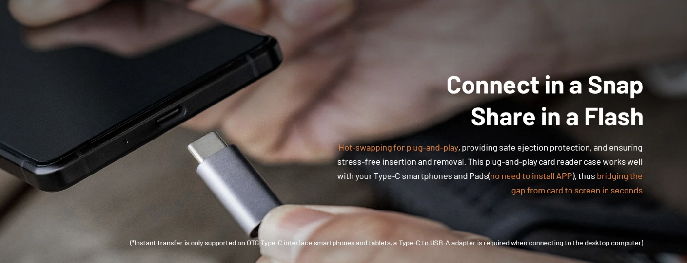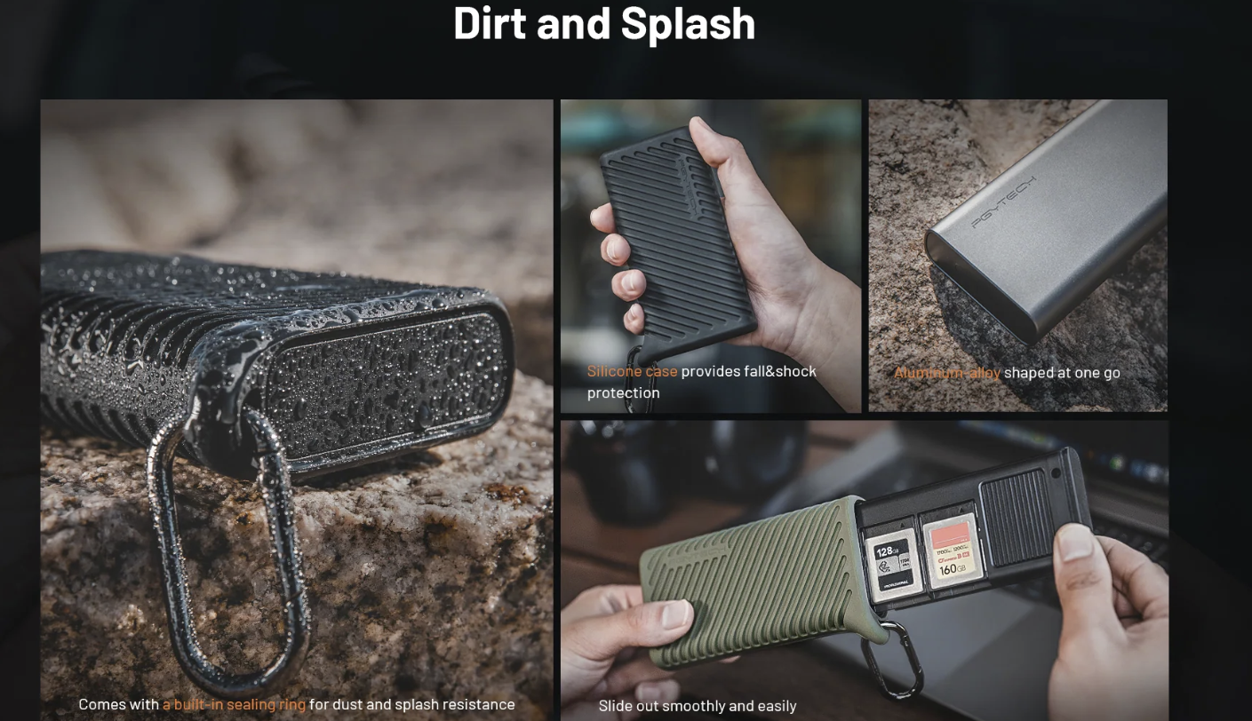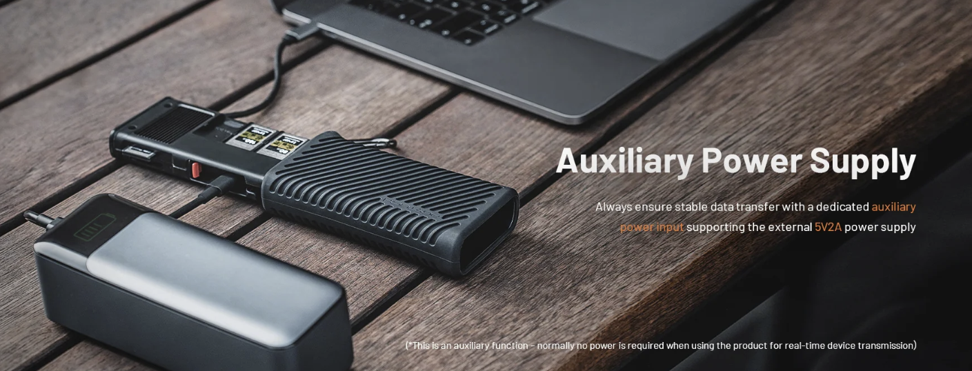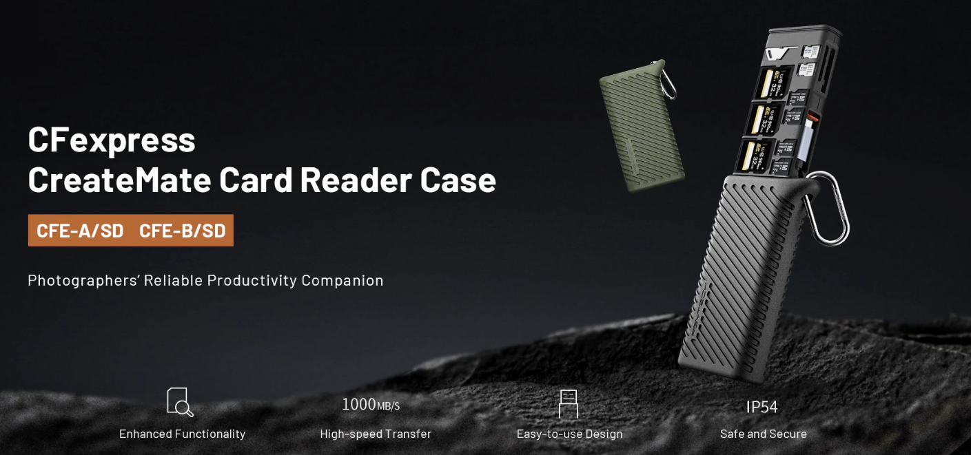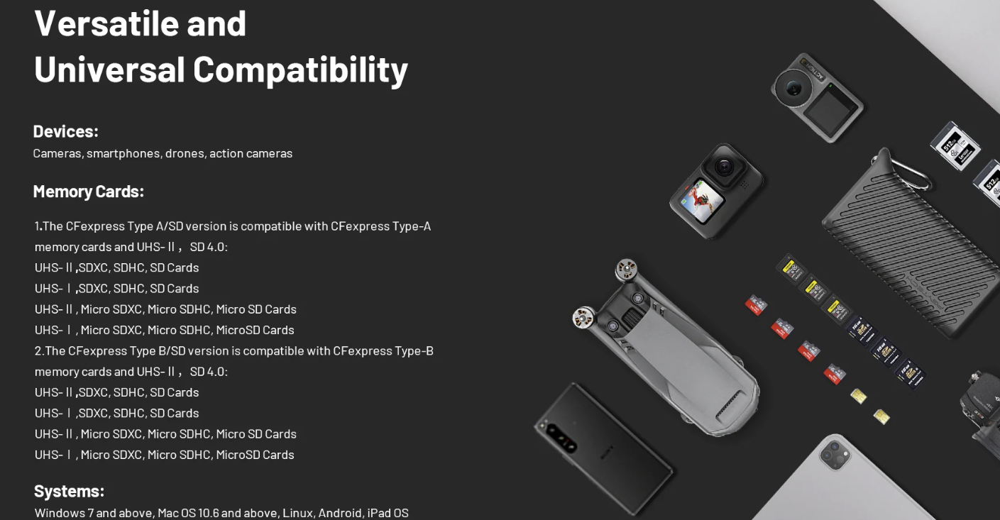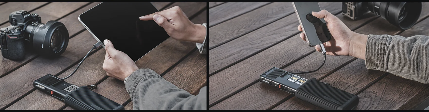 ·USB 3.2 Gen2 晶片使資料傳輸速率高達 10Gbps,支援 1000MB/s 的 CFA/CFB 卡和 312MB/s 的 SD 4.0/Micro SD 卡(附適配器的 Micro SD)。