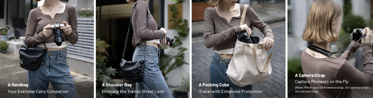 . 提供四種多功能模式,可用作手提包/單肩包/收納包/相機背帶。 3