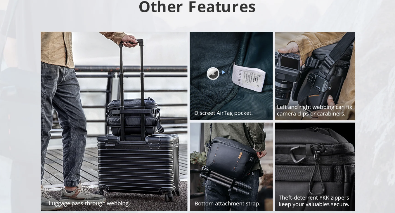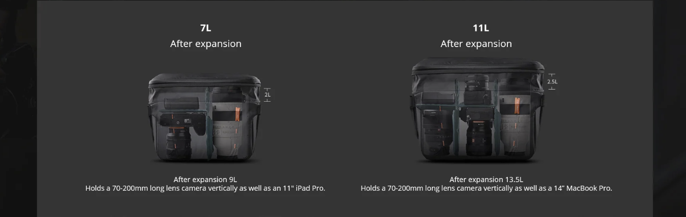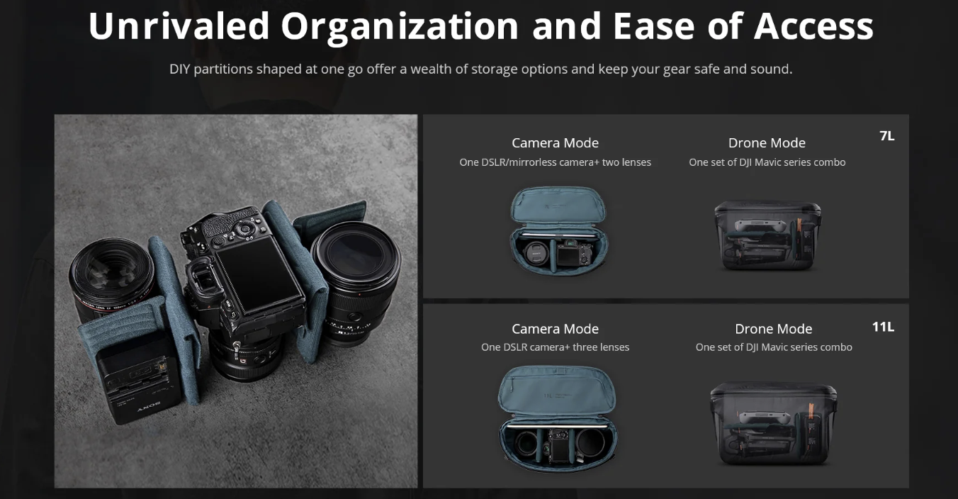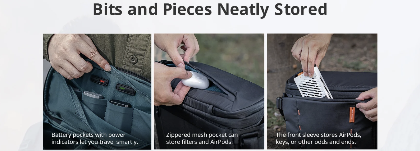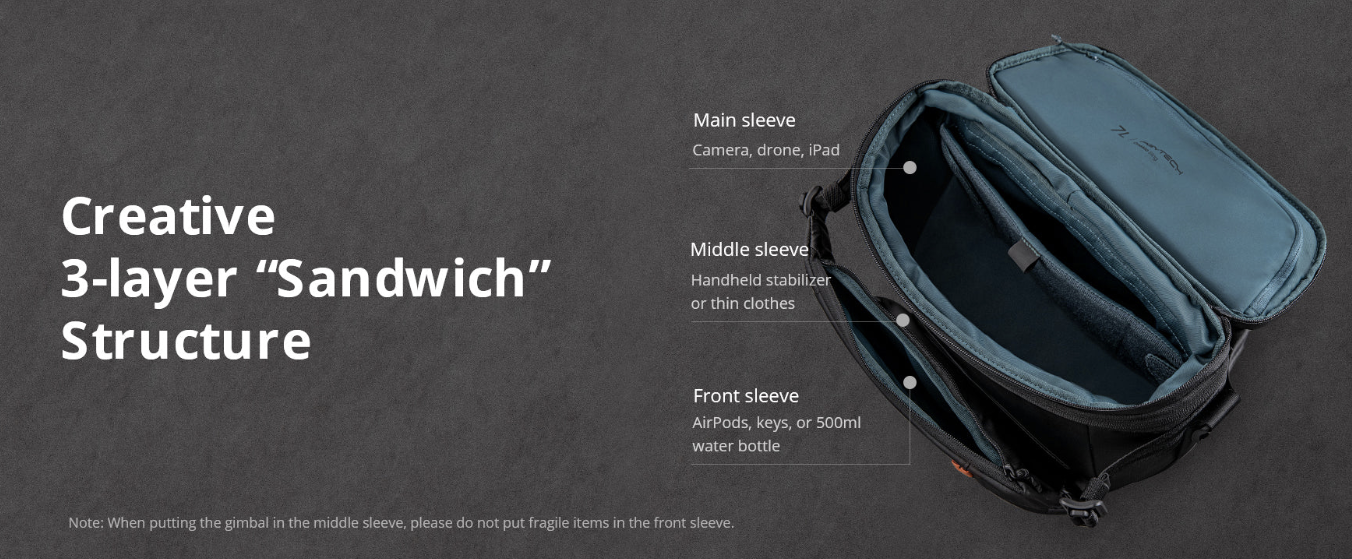 1. 創新的「三明治」結構,輕鬆收納您的裝備。主隔層可容納相機、無人機和 iPad,可調整的開放式中隔層則非常適合放置穩定器或大件物品。